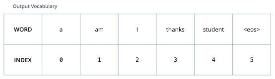 为了直观地视觉化讲解这一点,我们假设输出词汇表仅包含六个单词(“a”,“am”,“i”,“thanks”,“student”和“ <eos>”(“end of sentence”的缩写)) 。
