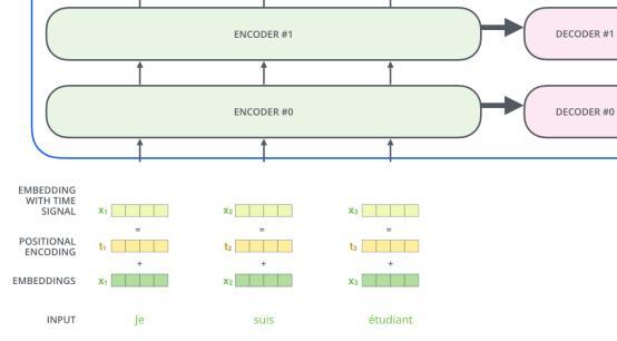 后续步骤一直重复该过程,直到得到一个特殊符号,标志着Transformer解码器已完成其输出。每个步骤的输出都被馈送到下一个步骤的底部解码器,并且解码器会像编码器一样,将其解码结果冒泡。就像我们对编码器输入所做的操作一样,我们给这些解码器输入做嵌入并添加位置编码来表示每个单词的位置。