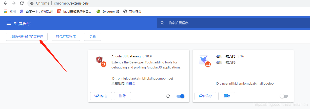 第二步:打开chrome浏览器,浏览器地址栏输入chrome://extensions/,进入扩展程序页面,勾选右上角开发者模式,点击加载已解压的扩展程序按钮,选择对应的文件夹,我这里是E:\soft\angularjs_google_browser\batarang-0.10.9,我们发现扩展程序下面就会多了一个angularjs batarang的扩展,如下