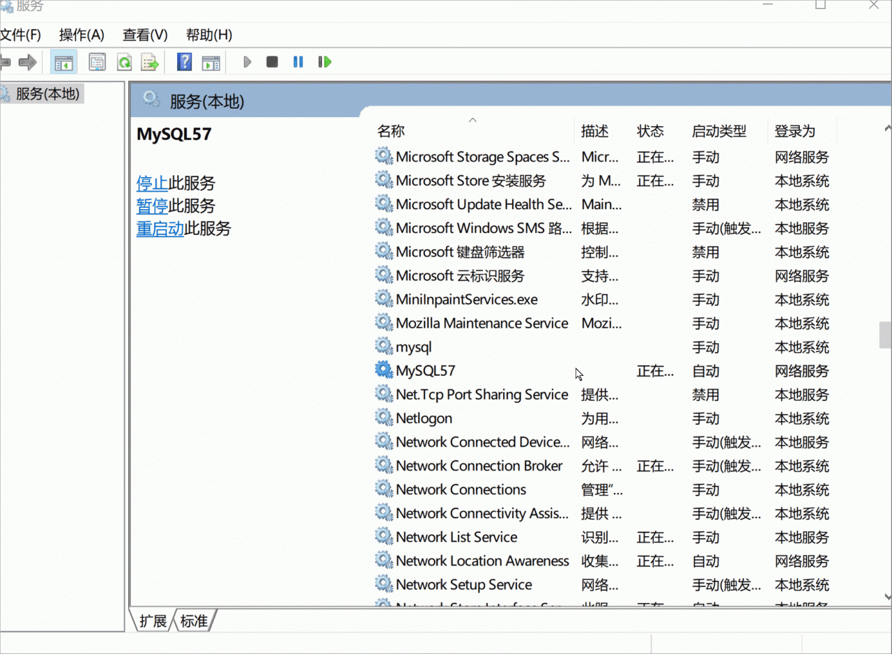 MySQL是一个客户端服务器程序,我们要重启MySQL服务器。我们在服务中找到MySQL之后,右键点击重启。重启后MySQL显示‘正在运行’,即重启成功!