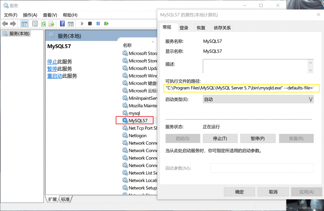 然后在服务中,找到MySQL,在常规中找到可执行文件路径,复制下来。