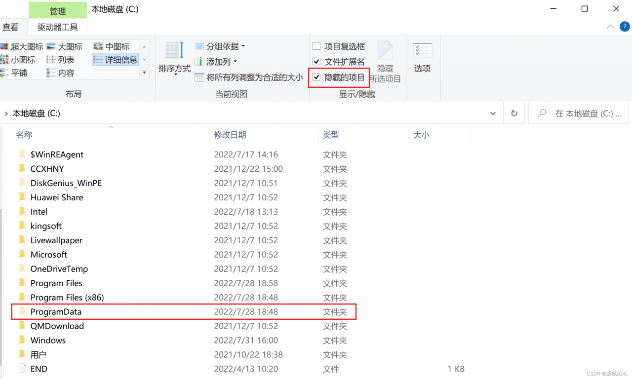 在查找过程中 大家肯能找不到 ProgramData 文件,一般这个文件都是隐藏起来的,我们点击显示隐藏项目就会出现。