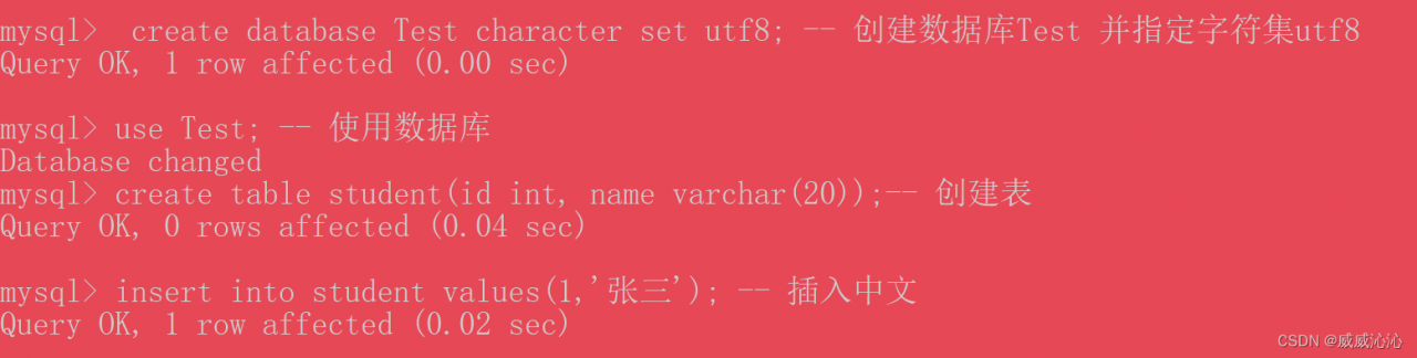 create database 数据库名 character set utf8;设置完后,我们就能想改数据库中插入中文啦。