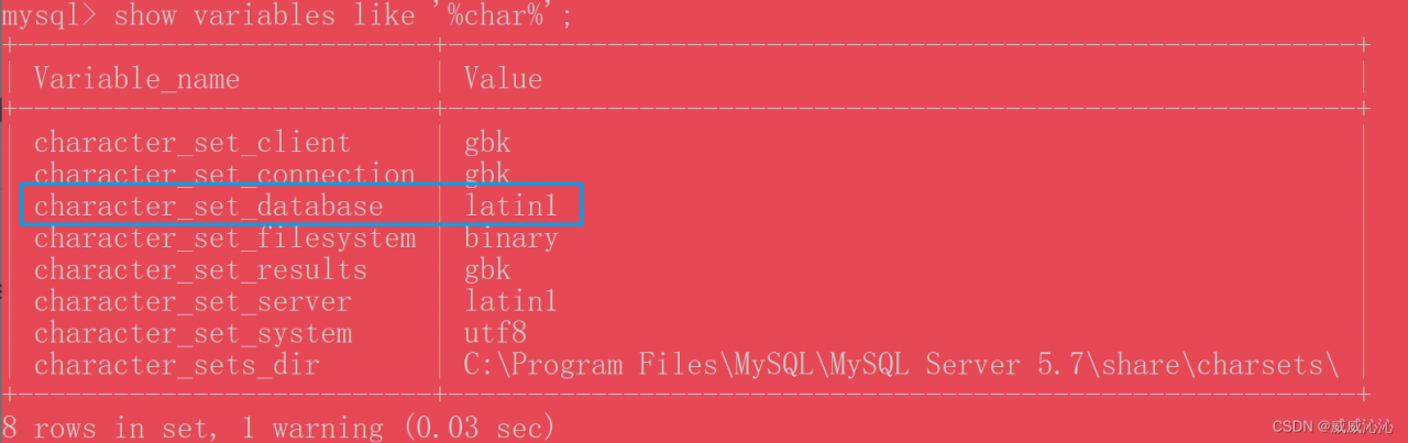 show variables like '%char%'; 我们看 character_set_database 这一行对应 Value的是 latinl,而 latinl 是拉丁文,是不支持中文的。