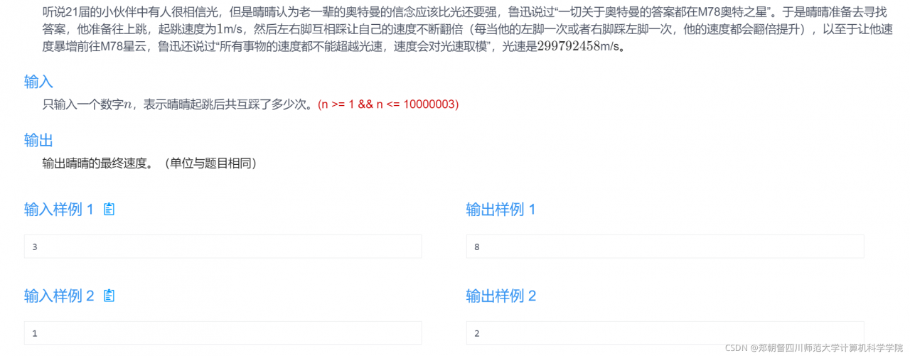 初始速度为1,每次脚踩脚会让速度翻倍,即乘以二,踩了n次,那么最后的速度就是2^n米每秒,如果用传统的方法那么时间复杂度为O(n),由于时间限制是400ms,当n过大时,运行就会超时,所以正确做法是使用快速幂,就可以将时间复杂度降低,代码如下: