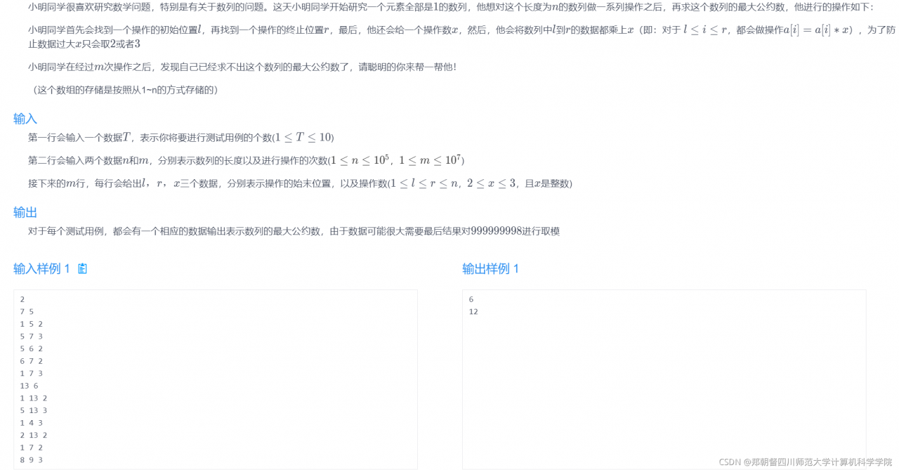 在m轮循环中,每一个数都或多或少的乘以了2或3,我们的目的是求最大公约数,按常理来说,直接每一轮分别乘就是了,但是!注意这题的时间限制是500ms,也就是这题大概率是要在运行时间卡我们,那么常规的方法大概率就是不行的,根据本周所学知识,其实就是考察快速幂的使用,也就是每个位置上的数成了多少个2,乘了多少个3,然后用快速幂求出来,所以我们就要分别记录下来每个位置乘了多少2和3,可以用两个数组来实现;但如果我们就是每个位置去挨个加一,那就和直接乘2,乘三没有区别了,还是多了一个for循环,造成超时,所以我们要用前缀和的方法来记录,这样就能少一层循环;