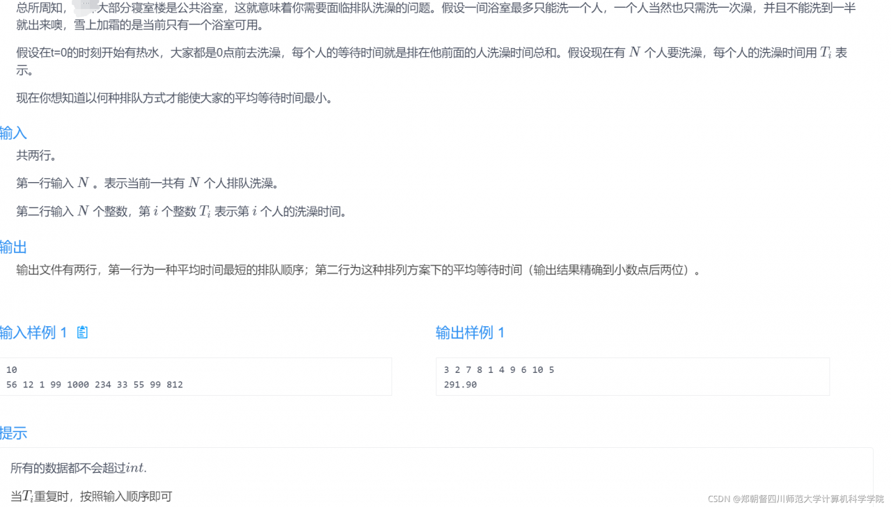 那么当前面一个人在洗澡的时候,后面所有人也就在等待,对于第一个人,她直接就进去洗澡了,她的等待时间为0,她在洗澡的时候,后面的人也就在等待,第二个人进去的时候,后面的人也就在等待,也就是说,后面的人的等待时间也就是前面洗澡的人的洗澡时间之和,所以这里可以想到要用到前缀和,那如何让总的等待时间最短呢?也就是让洗澡时间最长的人最后洗,这样其他人的等待时间就大幅缩减了,也就是说,最好的排序方式是按照洗澡时间从短到长排序,那么最后一个人洗澡时就没人需要等待了,所以这里要用到排序的知识,那么平均等待时间也就是所有人等待时间之和除以总人数;
