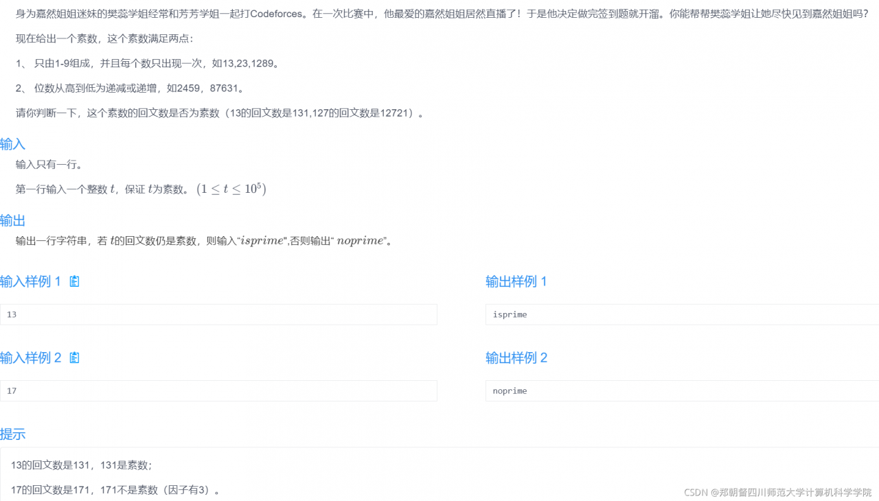 首先要将输入的数的回文数构建出来,然后再来判断是不是素数,我们可以分析出,最大的回文数为999999999,将近10亿!这么大的数,构建素数表再来做判断显然不可能,编译都要实际二十多秒(当时我还以为是软件的问题),所以大概率这题也就是用最常规的方法做判断是不是素数, 难点在于构建回文数,emmm,好吧其实也不算是难点,写多了就会了,
