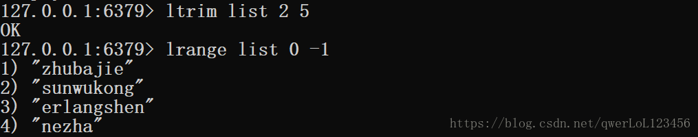 ltrim key start stop #从start(开始索引)开始到stop(结束索引)结束 截取list 形成一个新的list