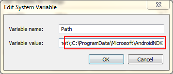 选中System的path变量,进行编辑,把 ;C:\ProgramData\Microsoft\AndroidNDK64\android-ndk-r10e添加到最后,保存: