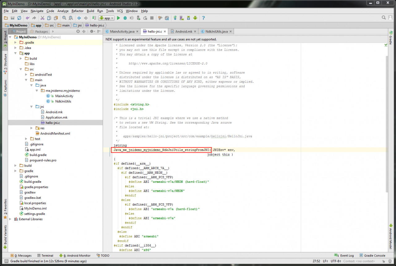 c)修改hello-jni.c文件中的函数名称,格式为:Java_包名_类名_函数名( Java_me_jnidemo_myjnidemo_NdkJniUtils_stringFromJNI)