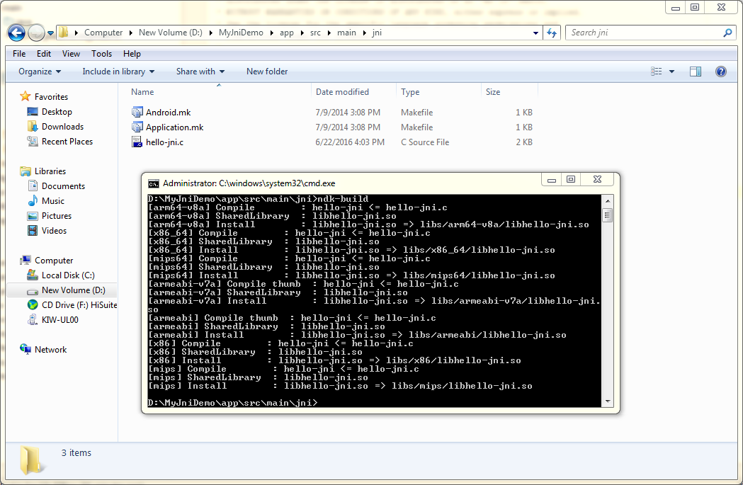 d) jni文件夹 右键=>show in Explorer 进入目录;cmd进入此文件夹中,ndk-build命令进行编译: