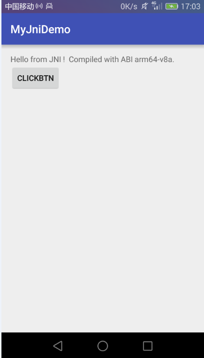 package me.jnidemo.myjnidemo; import android.support.v7.app.AppCompatActivity; import android.os.Bundle; import android.view.View; import android.widget.Button; import android.widget.TextView; public class MainActivity extends AppCompatActivity { TextView ev1; @Override protected void onCreate(Bundle savedInstanceState) { super.onCreate(savedInstanceState); setContentView(R.layout.activity_main); ev1=(TextView)findViewById(R.id.edv) ; Button btn=(Button)findViewById(R.id.clickId); btn.setOnClickListener(new Button.OnClickListener(){ @Override public void onClick(View v) { String res=NdkJniUtils.stringFromJNI(); ev1.setText(res); } }); } }