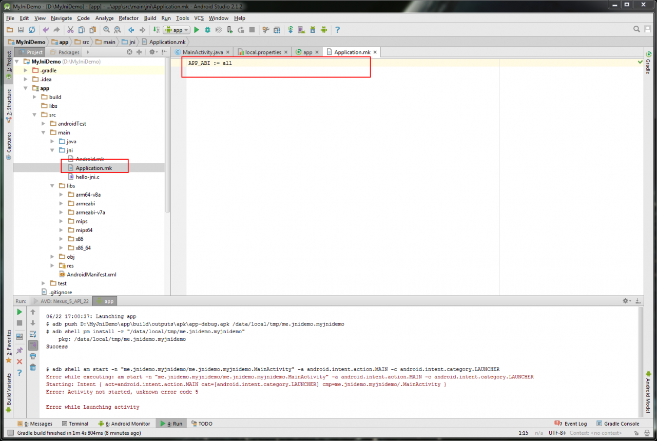 大体意思就是说gradle尝试自己编译你的源文件,而不是使用你编译好的.so文件。既然在cmd中编译通过了,那么咱们可以通过配置,禁用gradle的ndk调用行为
