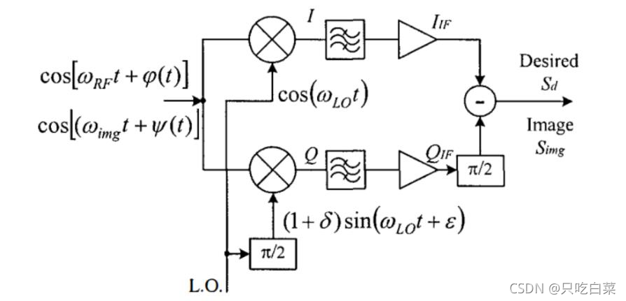 I 和 Q 信号的不平衡限制了镜像抑制和接收机或发射机的动态范围。镜频抑制公式可以根据下图所示的简化的正交转换系统模型推导出。接收到的射频期望信由振幅归一化的频率和角度调制表示。假设 I 和 Q 通道中的所有不平衡都集中在正交 LO 信号的不平衡上,幅值归一化 I 和 Q 的 LO 信号表示为???(????)和(1 + ?)???(???? + ?),其中?是幅度不平衡, ?是相位不平衡。