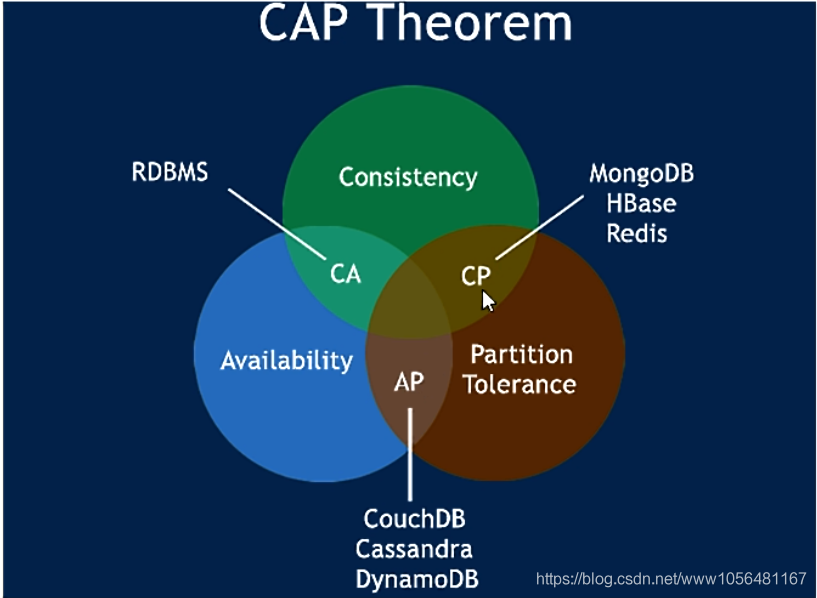 CAP理论的核心是:一个分布式系统不可能同时很好的满足一致性、可用性和分区容错性这三个需求,因此,根据CAP原理将NoSQL数据库分成了满足CA、CP、AP 原则 三大类: