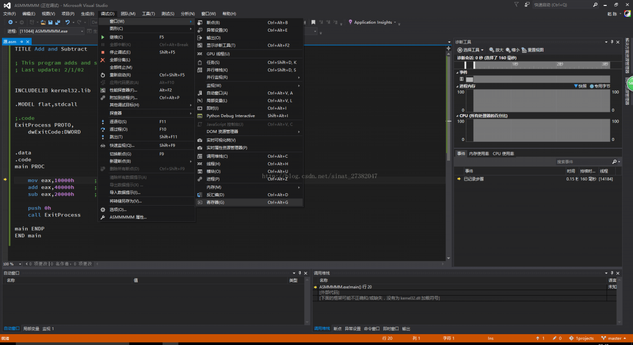 最后,输出,调试时选择菜单 调试-》窗口-》寄存器 就能看到寄存器值。(这样,就不至于苦逼地用指令-ip一步步看了吧~)