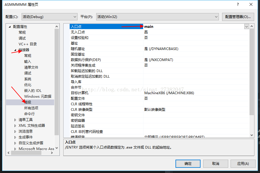 5.选中项目右键-》属性-》链接器-》高级-》 入口点 填 "main"