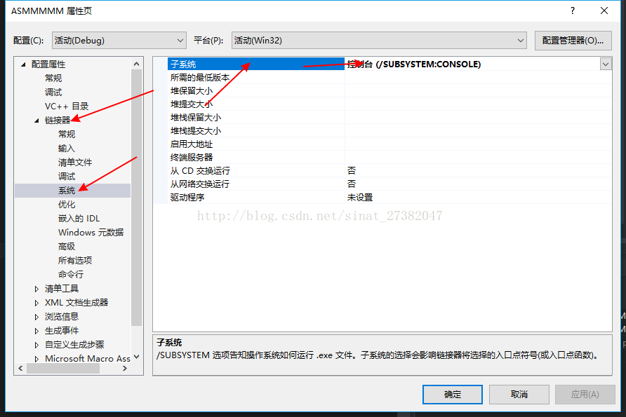 4.选中项目右键-》属性-》链接器-》系统-》 子系统选 “控制台(SUBSYSTEM:CONSOLE)”