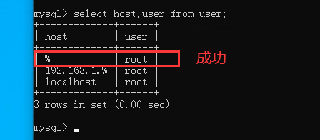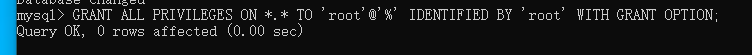 命令 : GRANT ALL PRIVILEGES ON *.* TO 'root'@'%' IDENTIFIED BY 'root' WITH GRANT OPTION;