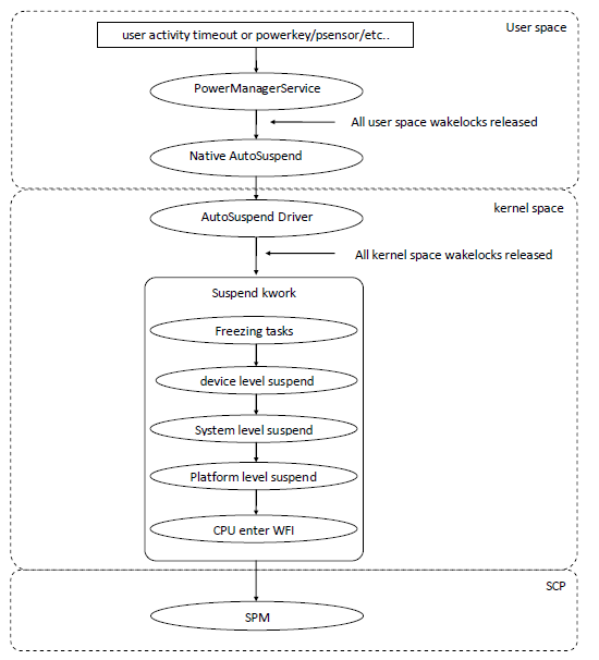 这里的suspend确切的说是MCU(ARM )的 suspend,也就是cpu进入Wait for interrupt状态(WFI);因为对整个系统来说,CPU进WFI是整个系统睡眠的先决条件,我们debug也是从CPU是否进入WFI开始,从Linux的角度来说,CPU进入suspend就是SW完全不跑了,停在suspend workqueue里面。