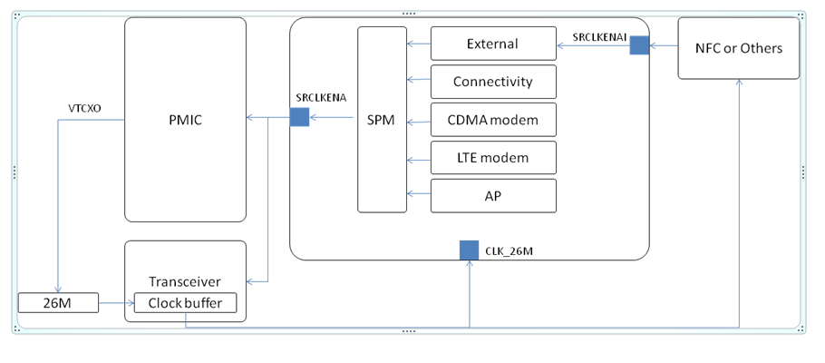 跟SPM强相关的一个东西就是系统中的时钟请求信号,也就是26M时钟开关的控制逻辑;因为系统工作在最小电流的时候,SPM只依靠32K时钟工作;因此要判断系统是不是已经到深睡状态,就要看26M有没有关闭