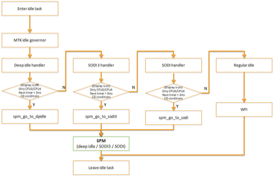 Mediatek的做法是在CPU在进入idle进程后,会去判断当前系统的状态是否满足进入更省电状态的条件,首先就会检查是否能进入deep idle,因为dpidle最省电