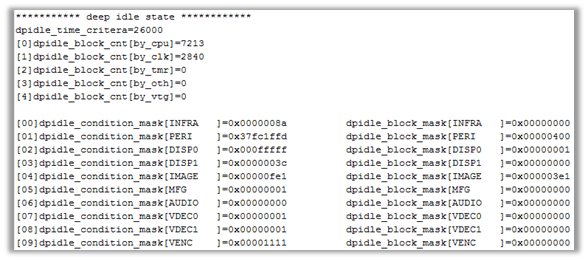 其中dpidle_block_mask里面的数值对应的bit位为1的,代表对应的clock卡住系统进入省电idle了.