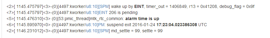 kernel的锁默认不会打印出来,一般是待机结束后通过节点来获取:adb shell cat /sys/kernel/debug/wakeup_sources > wakeup_sources.log