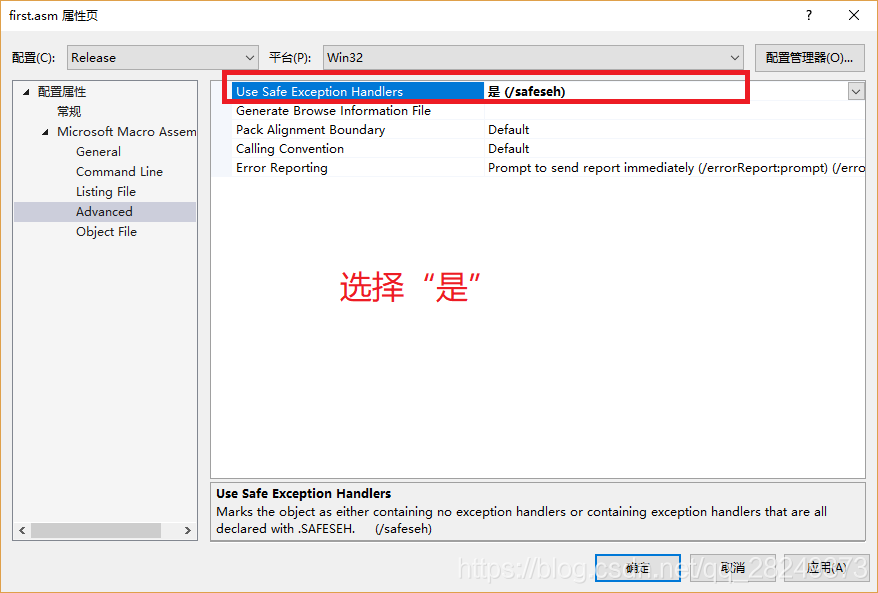 一般情况下,把“Use Safe Exception Handelers”项设为“是”,否则在“Release”模式下,生成解决方案会报错。这个后面会说到。