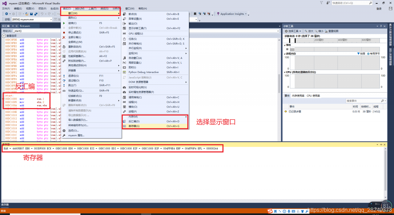 生成解决方案可以对程序进行调试。“生成》生成解决方案”,“调试》逐语句”。在“逐语句”调试模式下,可以查看寄存器的值。选择“调试》窗口》寄存器”