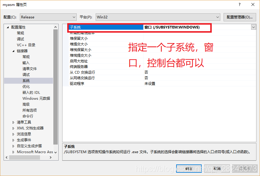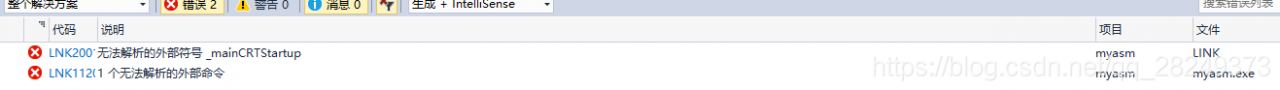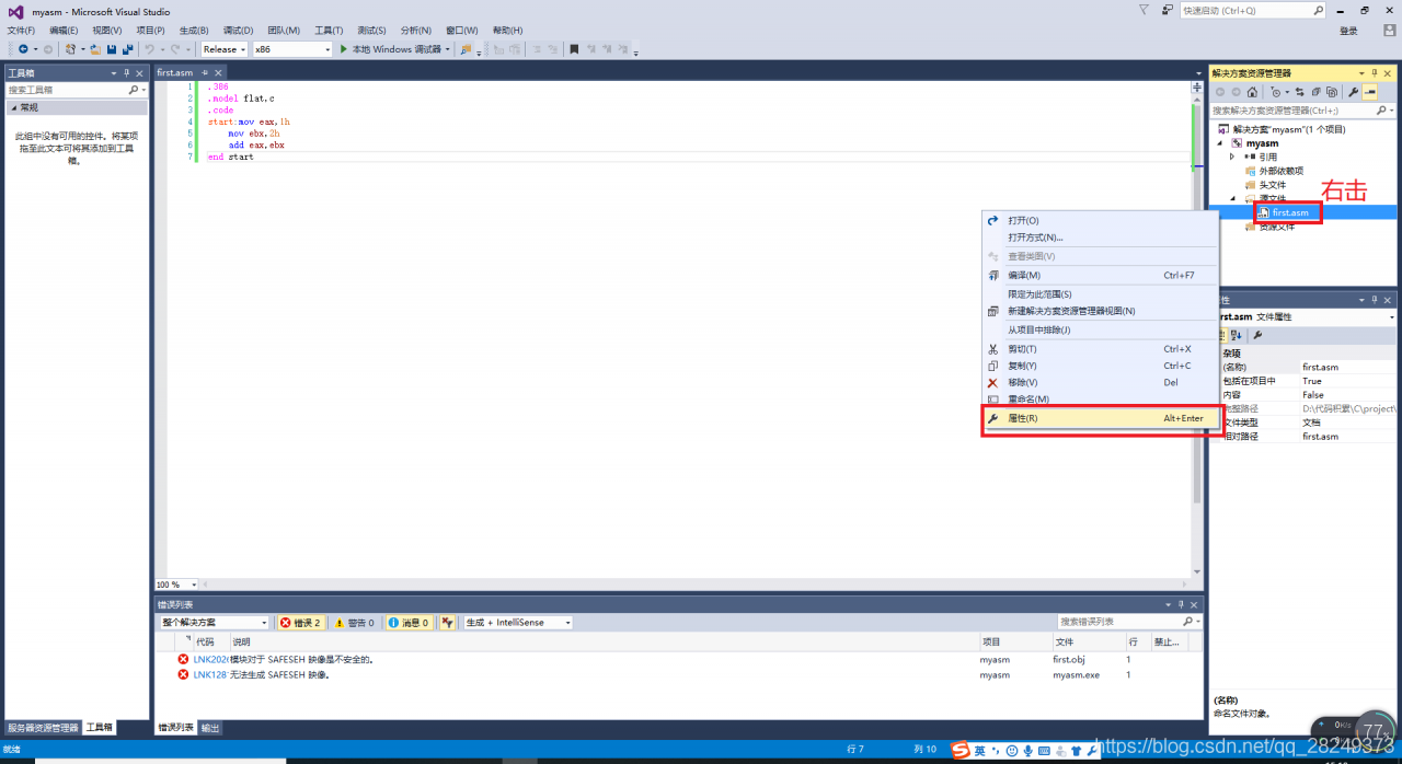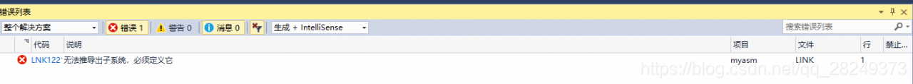 出错总结:如果“编译”报错,很可能是语法有问题。如果“编译”成功,而“生成解决方案”时报错,那就看看asm属性设置是否正确,是否指定了子系统,是否设置了入口点。