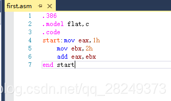 先写一段小代码测试一下是否配置正确。很短的代码,就是两个寄存器相加。start是标签,用来定义代码的位置,end表示程序结束,end后面的start表明了程序的入口点为start处,相当于C语言的main函数的入口点是main。一个工程中可以有一个或多个asm文件,要生成解决方案的话,就要指定一个入口点,让系统知道,程序应该从哪里开始。
