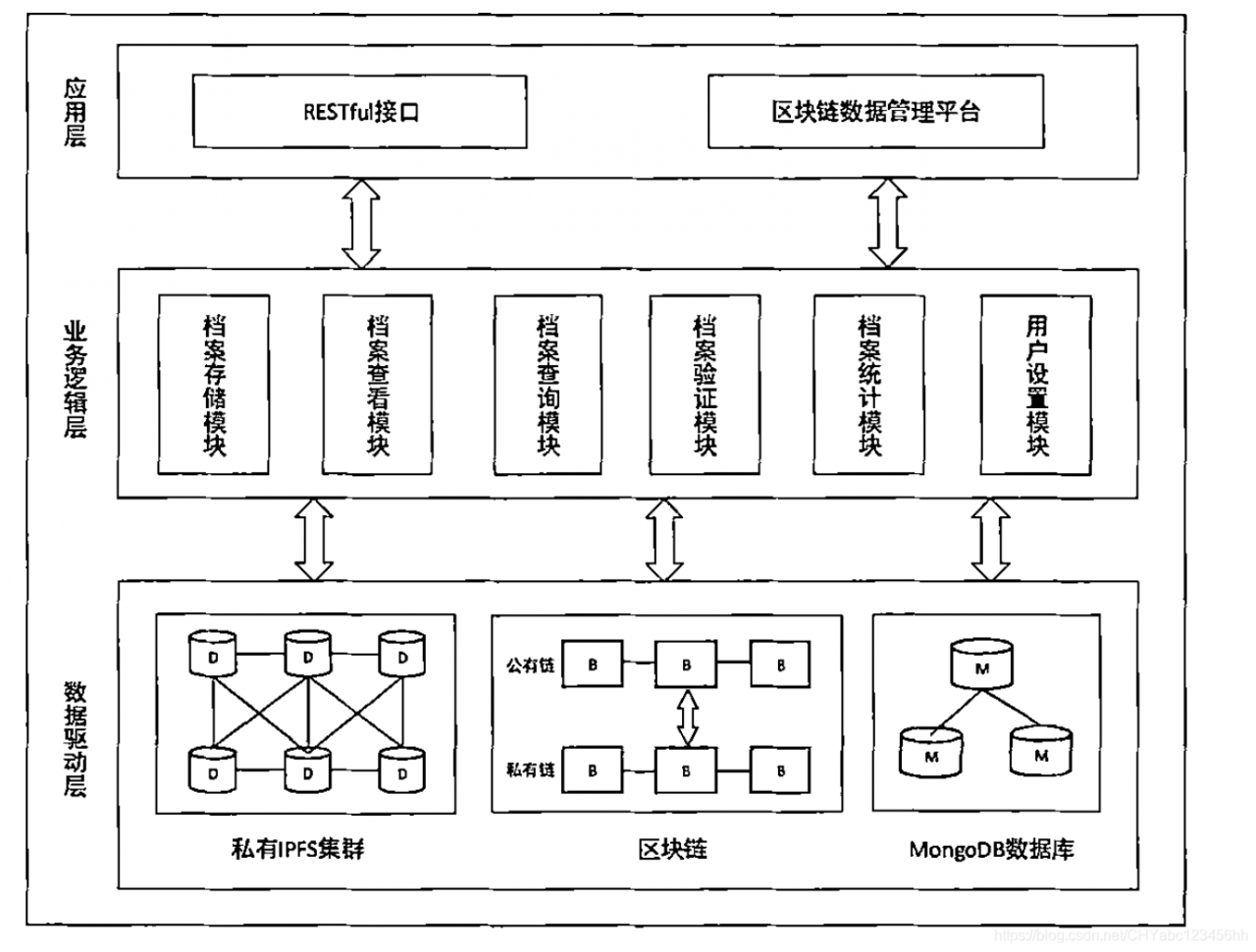 - 为了保障档案数据的安全性和隐私性,存储档案附件和档案属性存储加密存储在私有IPFS集群,档案的IPFS地址和数字指纹存储在私有区块链上。公有区块链定期存储和检查私有区块链最新不可逆区块的高度和哈希值,以保障私有区块链上数据的真实性。(私有链上的数据准确无误之后,才会将区块的哈希信息定期存储到公有链上,虽然引入了公有链保障了数据的安全性和可靠性,但是往公有链上记录数据需要花费手续费,因此可改用联盟链,但是联盟链的安全性相对于公有链很差,是一个半中心化的平台,需要进一步优化)