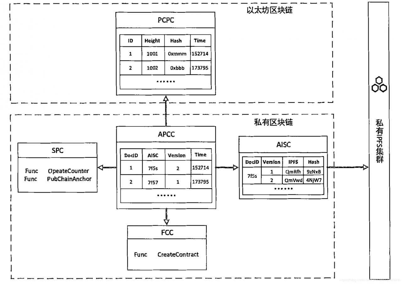 - 档案保护控制合约(Archive Protection Controller Contract,APCC)、自我保护合约(Self ProtectionContract,SPC)、工厂类合约(Factory ClassContract,FCC)是运行在私有链上的全局合约,其中SPC合约用于记录智能合约写入数据的次数,并定期与公有区块链进行锚定;FCC合约会在新增档案时,为每个档案创建对应的档案信息存储合约(AISC),AISC合约存储了档案的所有历史版本的摘要信息,包括档案对象哈希值和IPFS地址等;APCC合约存储了档案编号和AISC合约的对应关系。
