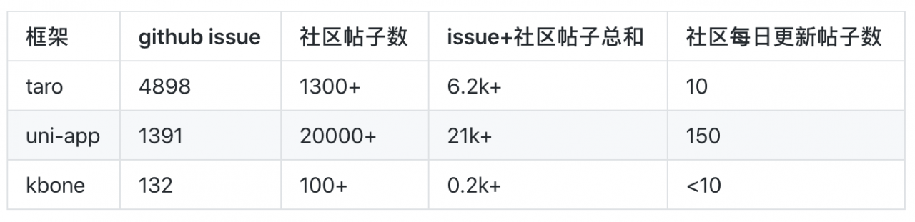 除了交流群外,DCloud对外公布的uni-app的开发者数量达到百万人,暂未看到taro和kbone公布此类数据。