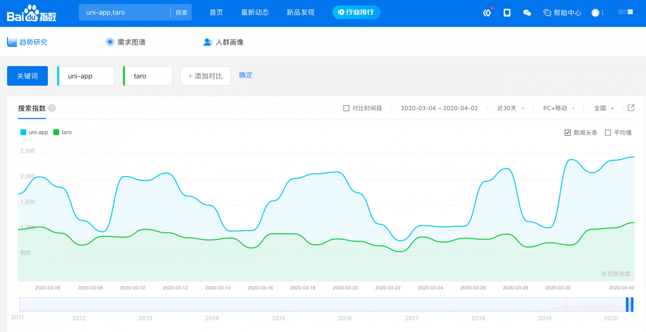 通过index.baidu.com,可查看主流框架的搜索指数,它代表了网友的搜索量和相关文章的收录量。目前kbone尚未收录到百度指数中,如下是近期 uni-app 和 taro的百度指数对比图: