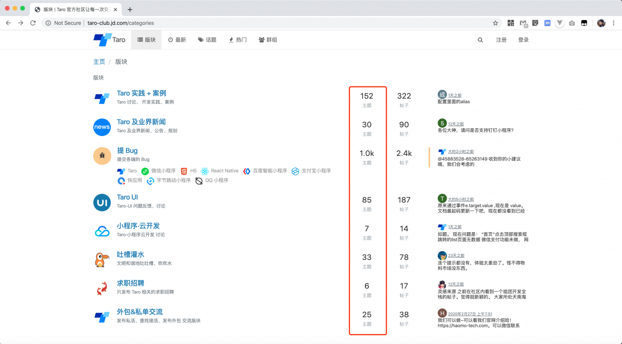 Taro 早期基于github issue进行产品Bug管理,目前累计已有近4898个issue;后于2019年5月上线开发者社区,和物料市场上线时间相同,目前沉淀1300+帖子,每日更新帖子在10个左右,相关数据计算方法如下: