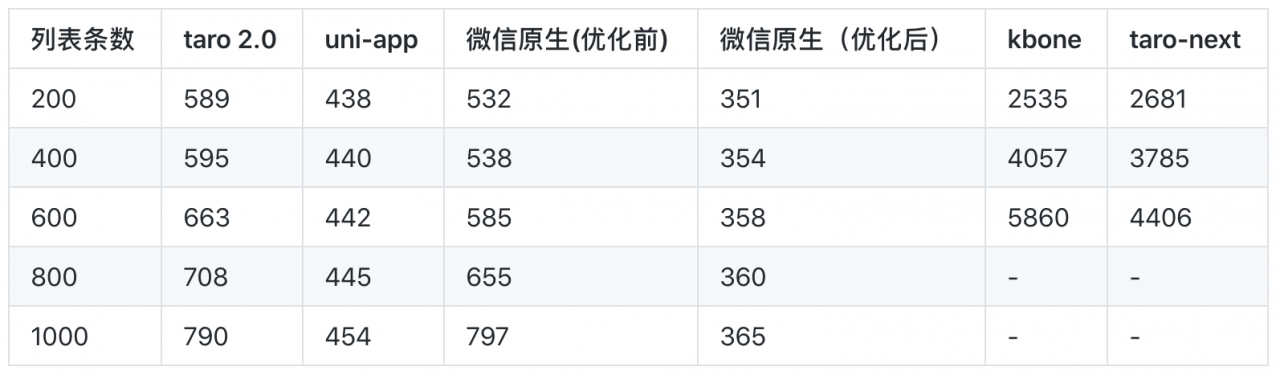 - taro、uni-app及微信原生,三个框架的数据都有大幅提升,400条记录时,至少都有300毫秒的优化