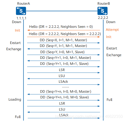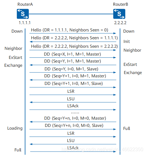 - Loading:正在同步LSDB。两端设备发送LSR报文向邻居请求对方的LSA,同步LSDB。