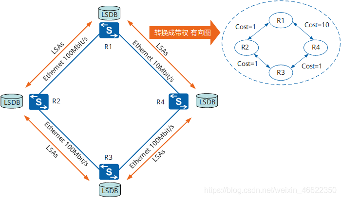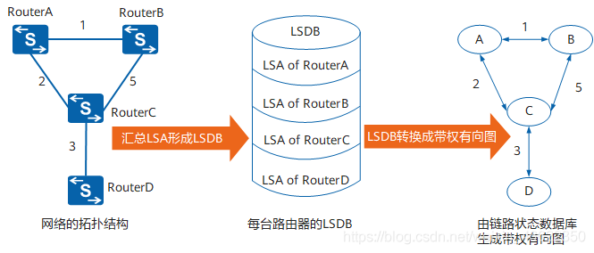 每台路由器都通过链路状态数据库LSDB(Link State DataBase)掌握全网的拓扑结构。如图所示,每台路由器都会收集其它路由器发来的LSA,所有的LSA放在一起便组成了链路状态数据库LSDB。LSA是对路由器周围网络拓扑结构的描述,LSDB则是对整个自治系统的网络拓扑结构的描述。路由器将LSDB转换成一张带权的有向图,这张图便是对整个网络拓扑结构的真实反映。在网络拓扑稳定的情况下,各个路由器得到的有向图是完全相同的。