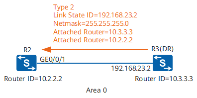 Network-LSA,也就是Type2 LSA,由DR(Designated Router)产生,描述本网段的链路状态,在所属的区域内传播。如图所示,R3向R2发送一条Network-LSA,列出了所有与DR形成完全邻接关系的路由器的Router ID。