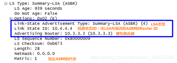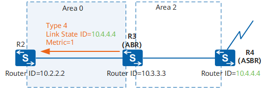 ASBR-summary-LSA,也叫Type4 LSA,由ABR发布,描述到ASBR的路由信息,并通告给除ASBR所在区域的其他相关区域。如图所示,R3作为ABR通告ASBR-summary-LSA到Area 0中。