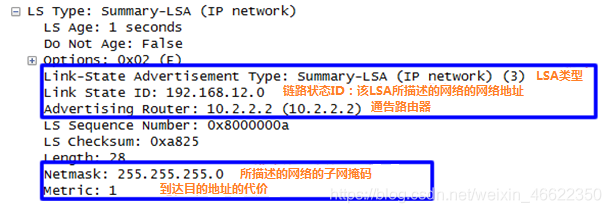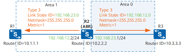 Network-summary-LSA,也叫Type3 LSA,由ABR发布,用来描述区域间的路由信息。ABR将Network-summary-LSA发布到一个区域,通告该区域到其他区域的目的地址。实际上,ABR是将区域内部的Type1和Type2的信息收集起来并汇总之后扩散出去,这就是Summary的含义。如图所示,R2作为ABR,将Area 0和Area 1中的路由信息分别发布对方区域。