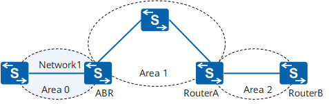 Area 2没有连接到骨干区Area 0,所以RouterA不能作为ABR向Area 2生成Area 0中Network1的路由信息,所以RouterB上没有到达Network1的路由。此时可以考虑部署虚连接来解决这个问题。