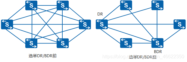 在广播网络和NBMA网络中,任意两台路由器之间都要传递路由信息。网络中有n台路由器,则需要建立n*(n-1)/2个邻接关系。这使得任何一台路由器的路由变化都会导致多次传递,浪费了带宽资源。