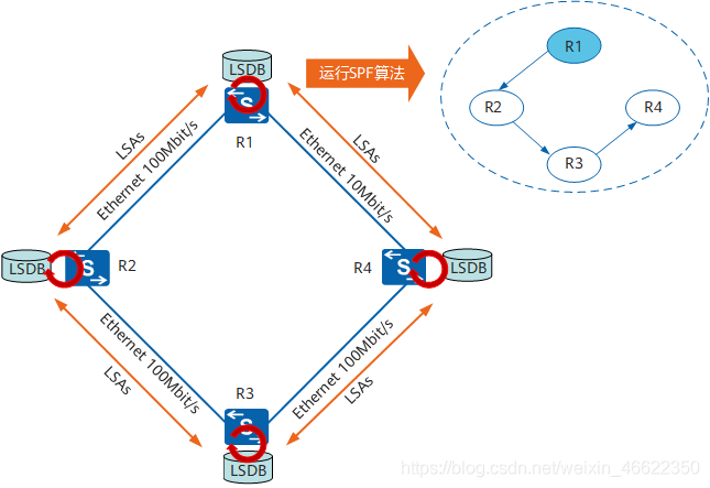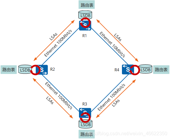 通过LSA的泛洪,路由器会把收到的LSA汇总记录在LSDB中。最终,所有路由器都会形成同样的LSDB。LSA是对路由器周围网络拓扑结构的描述,而LSDB则是对整个自治系统的网络拓扑结构的描述,LSDB是LSA的汇总。
