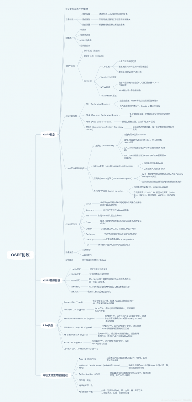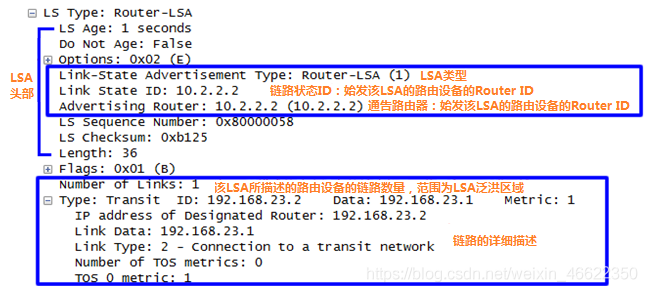 形成邻接关系的路由器之间可以交互LSA。LSA描述了路由器所有的链路、接口、邻居及链路状态等信息。路由器通过交互这些链路信息来了解整个网络的拓扑信息。由于链路的多样性,OSPF协议定义了多种LSA类型。