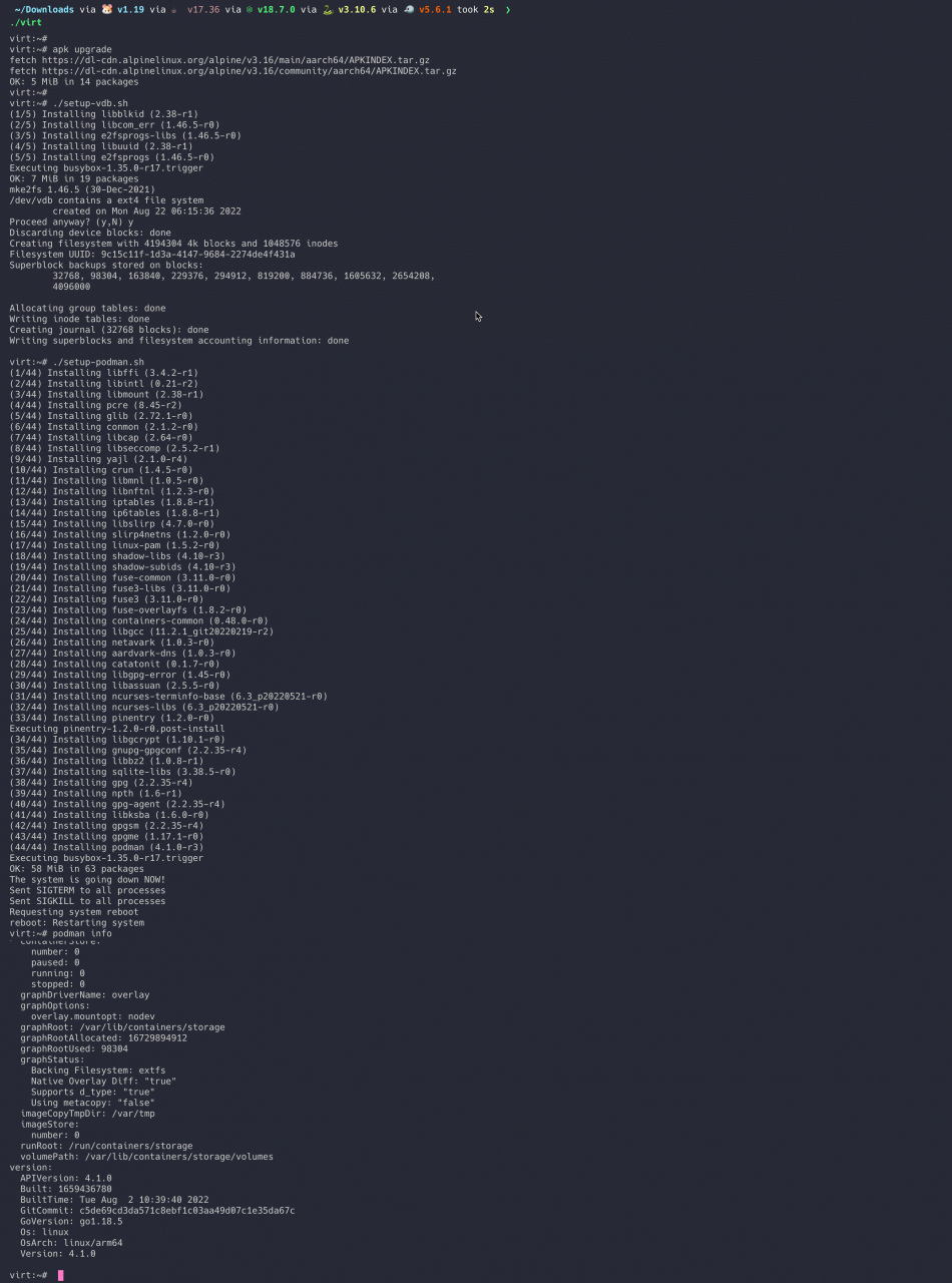Virt 是一个使用 macOS 原生虚拟化框架 Virtualization.framework 实现的轻量级虚拟机,虚拟机的操作系统是 Alpine 3.16,启动速度很快,几乎是秒级启动。并且内置了 Podman 和 K3d 的安装脚本,可一键安装。