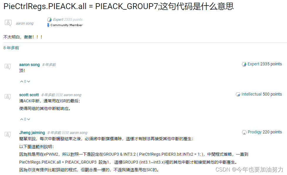 例: PieCtrlRegs.PIEACK.all=PIEACK_GROUP1;//中断已应答,可以从组1接收更多中断